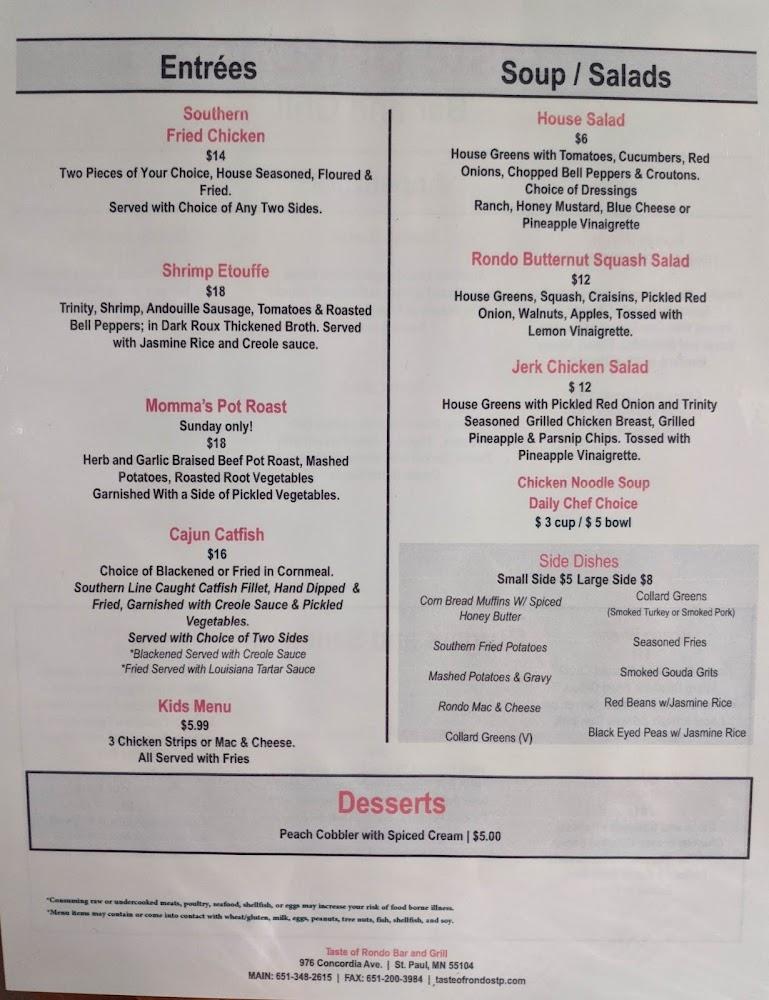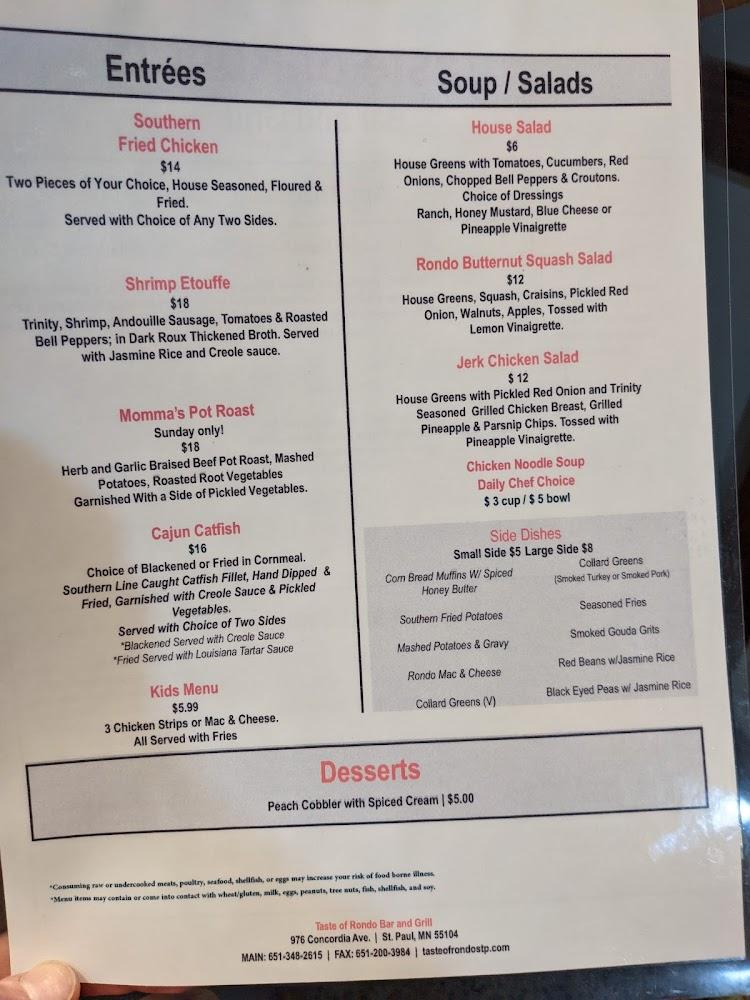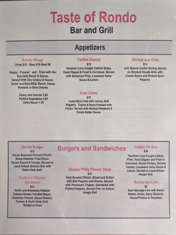 Taste of Rondo's menu features a delightful array of Southern specialties, highlighting comfort food at its finest. From the crispy Southern Fried Chicken to the rich Shrimp Etouffee, each dish reflects deep-rooted culinary traditions. The cornmeal-crusted catfish is another standout, perfectly paired with seasoned rice and red beans. Appetizers like Slim's Wings set the tone for a memorable meal, inviting sharing and enjoyment. Bluesy and homey, this menu satisfies cravings while supporting local ingredients. Vegetarian options are available, catering to diverse palates. Don’t miss the signature dessert—Peach Cobbler with Spiced Cream is a crowd favorite. Expect to spend around $20 to $30 for a filling experience, a deserving price for the flavors presented.